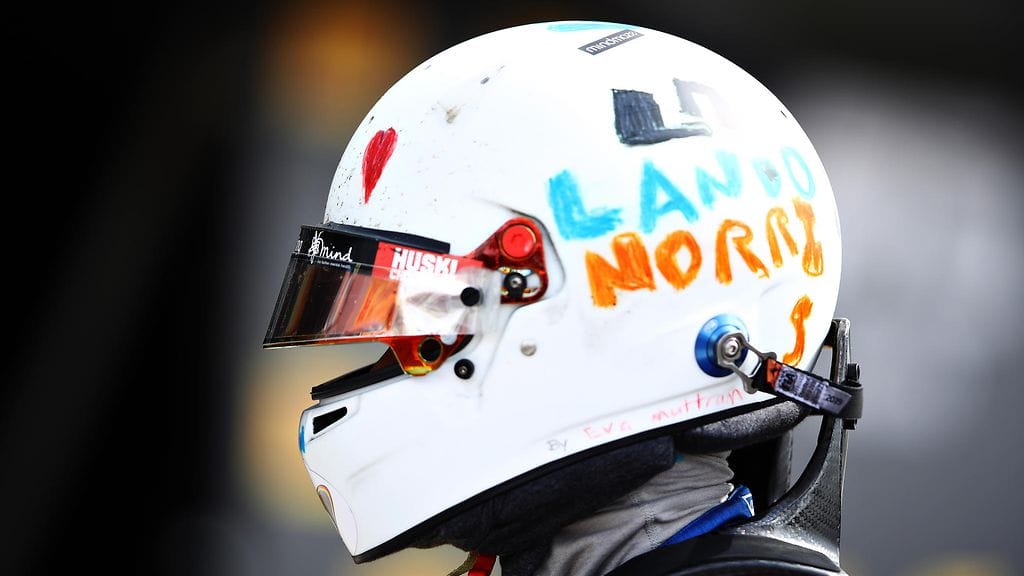 Norris toi Silverstoneen valkoisen kypärän, johon Eva oli piirtänyt McLarenin oranssin auton sekä kirjaillut suosikkikuskinsa nimen.