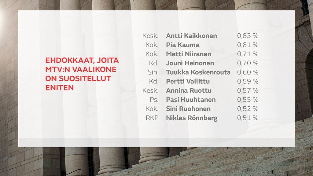 MTV Uutisten vaalikone on suositellut sopivaa ehdokasta jo lukuisille suomalaisille. Toistaiseksi vaalikone on suositellut kaikkein useimmiten keskustan Antti Kaikkosta.