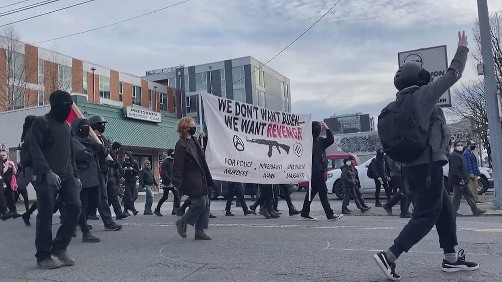 Portlandissa satapäinen väkijoukko marssi Bidenin valintaa vastaan. Marssi yltyi rähinöinniksi, kun osa ryhmästä rikkoi demokraattisen puolueen puoluetoimiston ikkunoita.