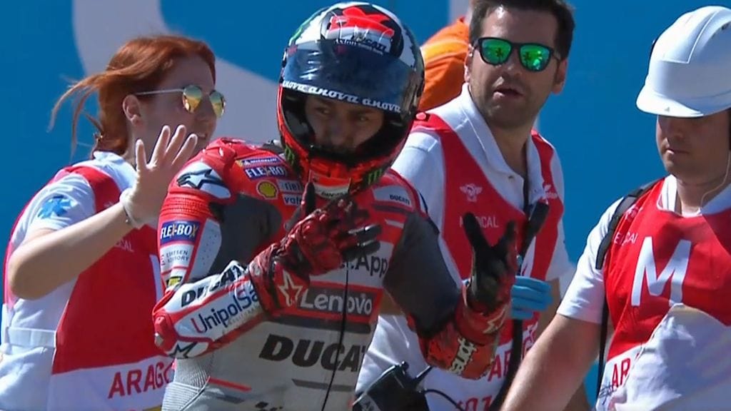 Lorenzo liu'utti startissa pyöräänsä Aragonin radan ulkokaarteessa hurjalla riskillä. Menopelinsä hallinnan lopulta menettänyt espanjalainen sinkoutui hurjaan ilmalentoon ja mätkähti rajusti asfalttiin.