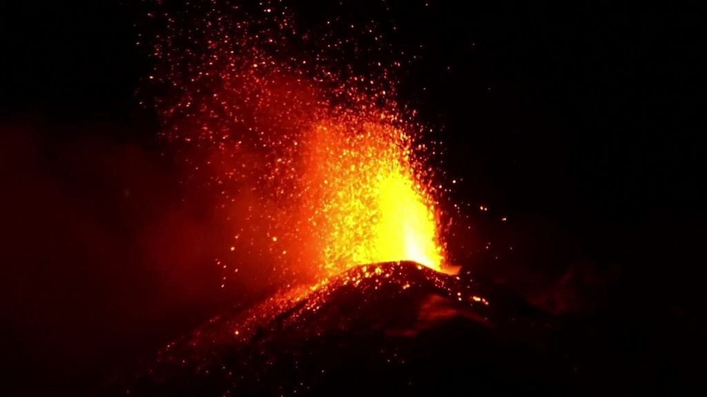 Kuten yllä olevalta videolta näkyy, vuori syöksi punaista laavaa pimeää ja yöllistä taivasta vasten.