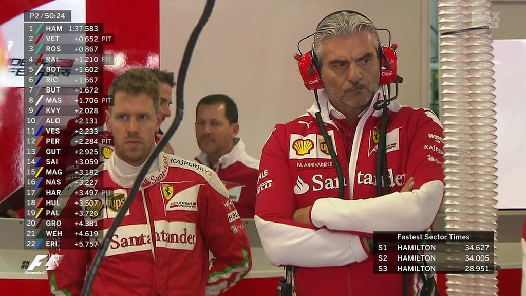 Vettel rullattiin pääsuoralta varikkopilttuuseen, ja kun hän tarkkaili tilannetta tallipäällikkö Maurizio Arrivabenen vieressä, kertoi tallipomon ilme kaiken oleellisen.