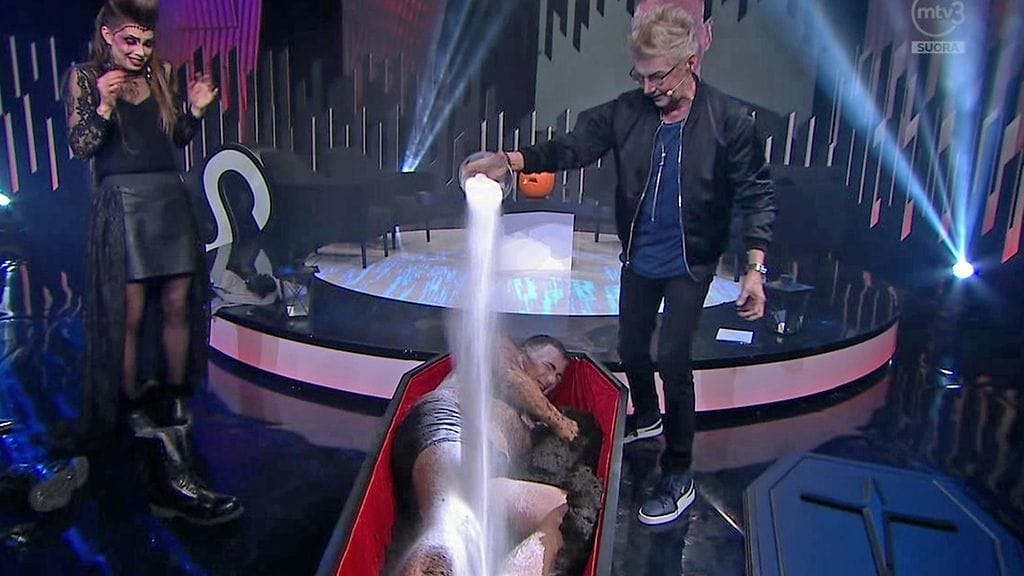 Viime viikolla "voitto" meni Pirkka-Pekka Peteliukselle , joka nyt sai valita uuden mustan laatikon sisällön. Mies oli kehitellyt halloween-teeman mukaisen yllätyksen. Mustan laatikon virkaa toimitti musta ruumisarkku.