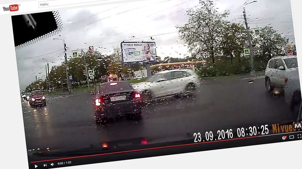 Pietarissa auton kojelautakameraan tallentui viime perjantaina järkyttävä kolari. Onnettomuus sattuu ruuhkaisessa risteyksessä, jossa kuljettajat matelevat eteenpäin vuoroaan odottaen.