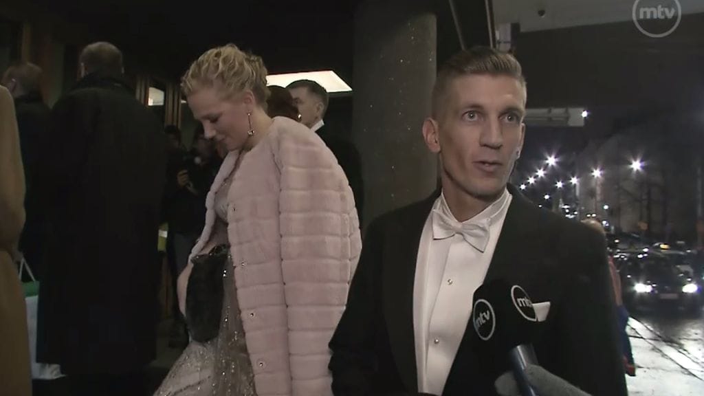 Entinen tennistähti Jarkko Nieminen edustaa itsenäisyyspäivän vastaanotolla yhdessä vaimonsa Anu Niemisen kanssa.