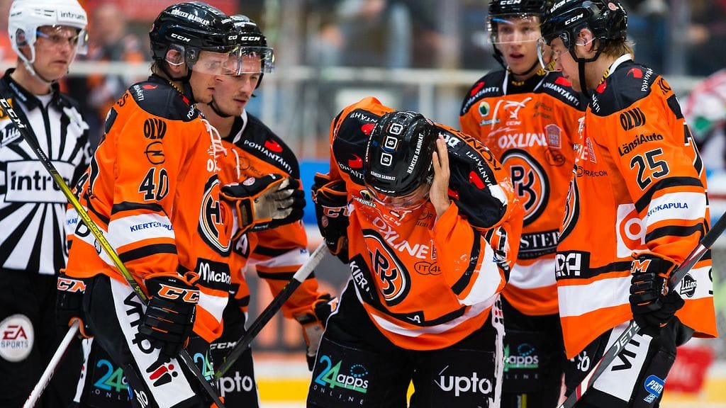 HPK huilauttaa ottelussa tähtihyökkääjiään. Sivussa illan ottelusta ovat muun muassa Jere Innala, Cody Kunyk ja Valtteri Puustinen.