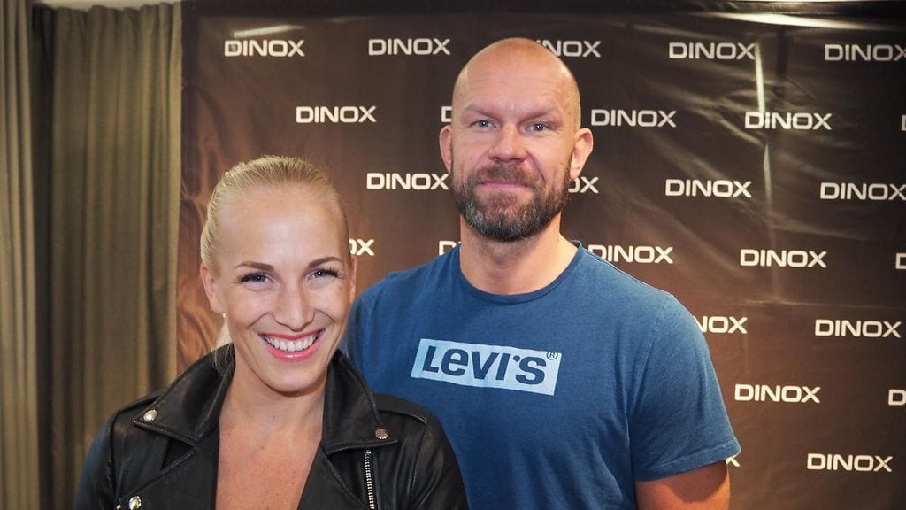 Entinen huippu-urheilija Jere Karalahti ja hänen vaimonsa Nanna Karalahti saapuivat kolmikuukautisen Alexia-tyttärensä kanssa Dinox-designliikuntavälineitä valmistavan yrityksen hyvinvointitapahtumaan.