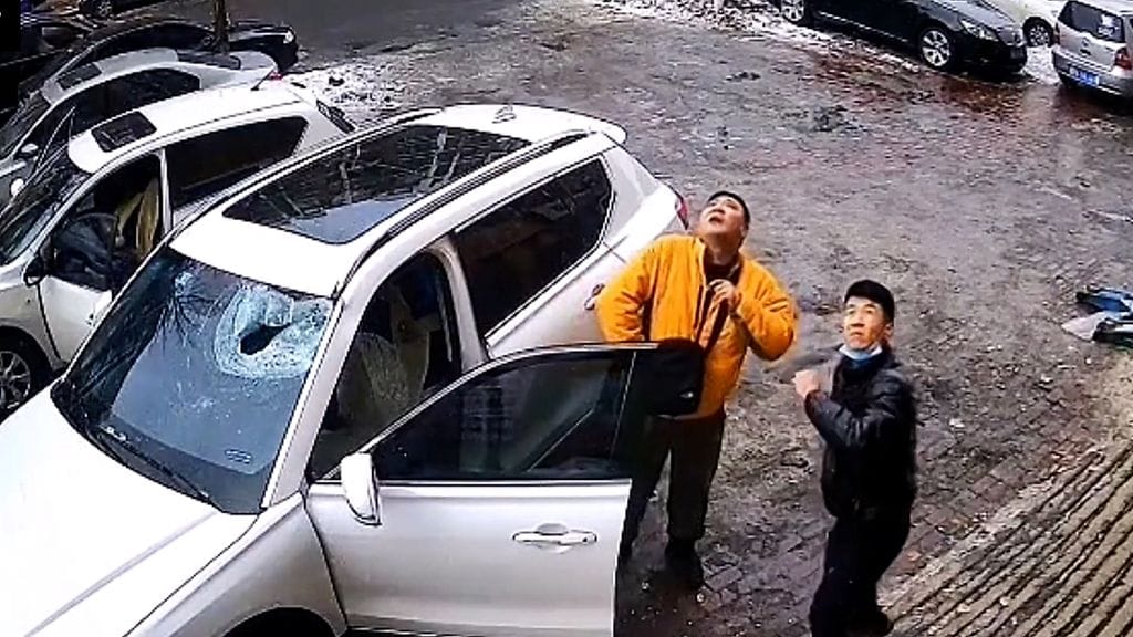 Kiinalaismies jutteli ystävänsä kanssa autonsa vieressä, kun taivaalta putosi valtava jääharkko suoraan auton tuulilasiin. Tapaus sattui Heilongjiangin maakunnassa.