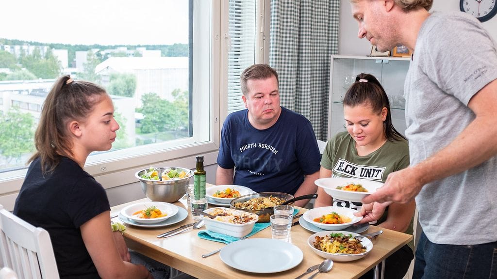 Perheessä syödään omia aikojaan ja omissa huoneissa. Tytöt eivät muista, milloin he olisivat istuneet perheenä pöydän ääreen yhdessä. Kari Aihinen on huolissaan perheen tottumuksista.