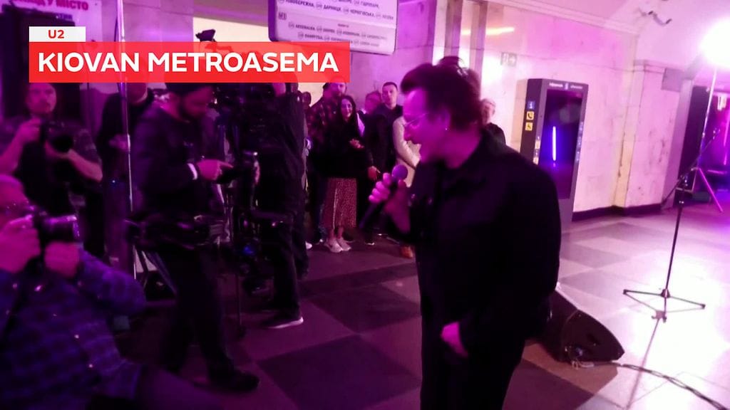 U2-yhtyeestä tutut Bono ja The Edge esiintyivät Kiovan metroasemalla.