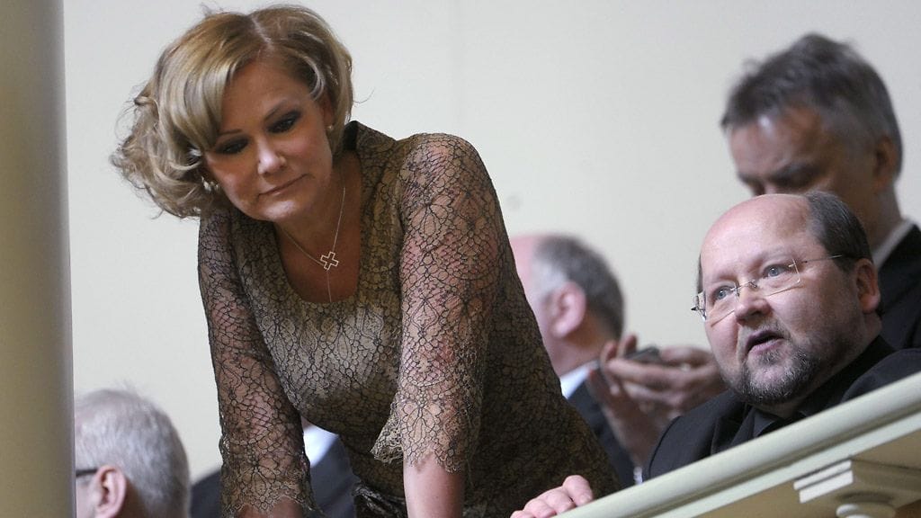 Europarlamentaarikot Eija-Riitta Korhola ja Mitro Repo odottivat innolla tasavallan presidentin virkaanastujaisien alkamista eduskunnassa Helsingissä 1. maaliskuuta.