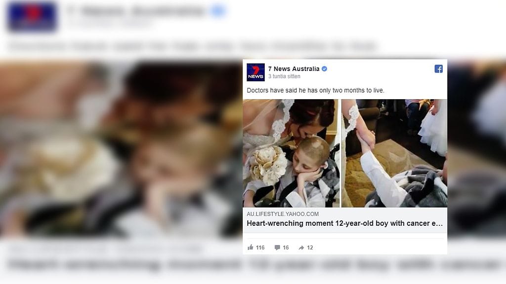 12-vuotias Keith on sairastanut pehmytkudossarkoomaa kuusi vuotta, ja hiljattain lääkärit kertoivat, että pojalla olisi enää pari kuukautta elinaikaa. Hänen viimeinen toiveensa oli saattaa äitinsä alttarille tämän häissä, joten perhe järjesti seremonian kotonaan. Koskettava hetki tallentui videolle.