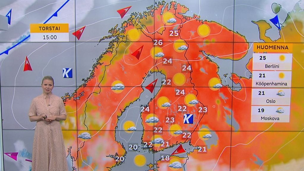 Tänään keskiviikkona tai huomenna saattaa helleraja mennä rikki Lapissa, mutta muualla Suomessa lämpötilat pyörivät parinkymmenen asteen tienoilla.