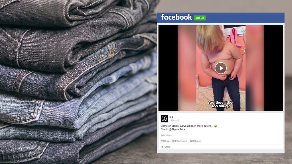 GO!-Facebook-sivun jakamalla videolla pikkulapsi yrittää saada jalkaansa selkeästi liian pienet farkut. Äiti Alyssa Price kehottaa lasta tanssimaan ”hoikkien farkkujen tanssin”.