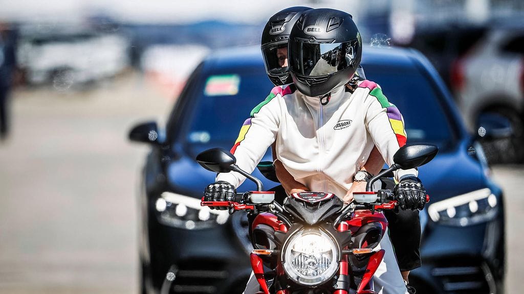 Hamilton saapui perjantaina F1-varikolle näyttävästi moottoripyörällä. Alla oli erikoisvalmisteinen MV Agusta Brutale Dragster RR LH44.