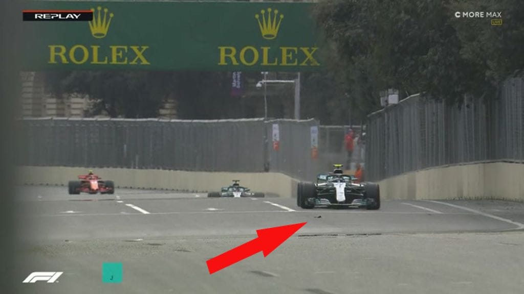 Bottas menetti formula ykkösten Azerbaidzhanin GP:n voiton ajettuaan hiilikuituromun yli. Hänen oikea takarenkaansa puhkesi, mikä pudotti suomalaisen sijalle 14.