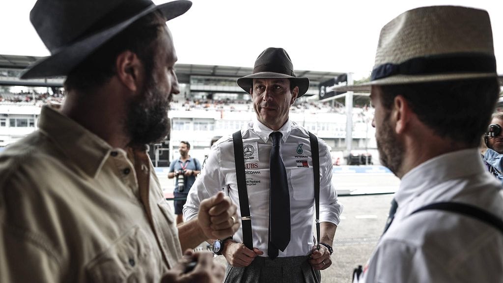 Raivostunut tallipomo Toto Wolff takoi varikolla työpöytäänsä. Viikonloppu oli tiimille iso, mikä näkyi kaikessa Mercedeksen toiminnassa juhlaviikonloppuna. Tiimi pukeutui vaakalaudalla olevaan Saksan kisaan 1950-luvun retrovaatteisiin 65 vuoden takaisen F1-debyyttinsä hengessä.