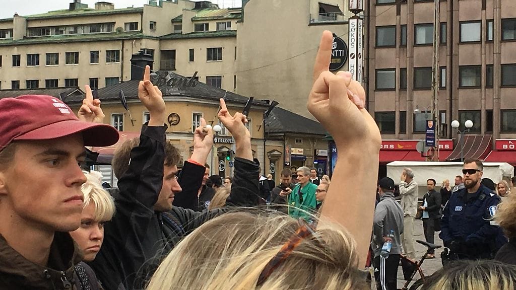 Vastamielenosoittajat ovat kääntäneet selkänsä Suomi ensin -ryhmän tilaisuudelle ja osallistujat ovat kohottaneet keskisormea.