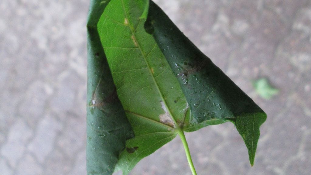 Pääkaupunkiseudulla lukuisten vaahterapuiden lehdistö on muuttanut ulkomuotoaan. Lehdet ovat käpristyneet rullalle kärjistään ja muuttuneet tummiksi.