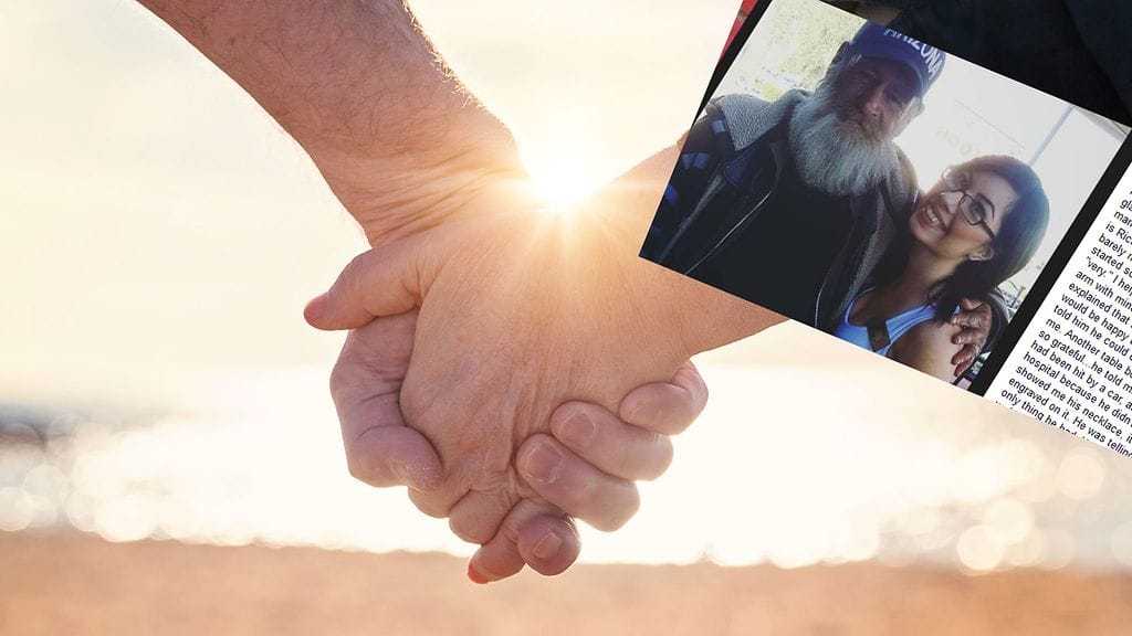 Hän ajoi Hootersin parkkipaikalle, ja huomasi parrakkaan, epäsiistin miehen istumassa jalkakäytävän reunalla. Sen sijaan, että nainen olisi rynnännyt kiireellä työpaikalleen välittämättä miehestä, hän käveli suoraan hänen luokseen kysyäkseen, oliko tällä kaikki kunnossa.