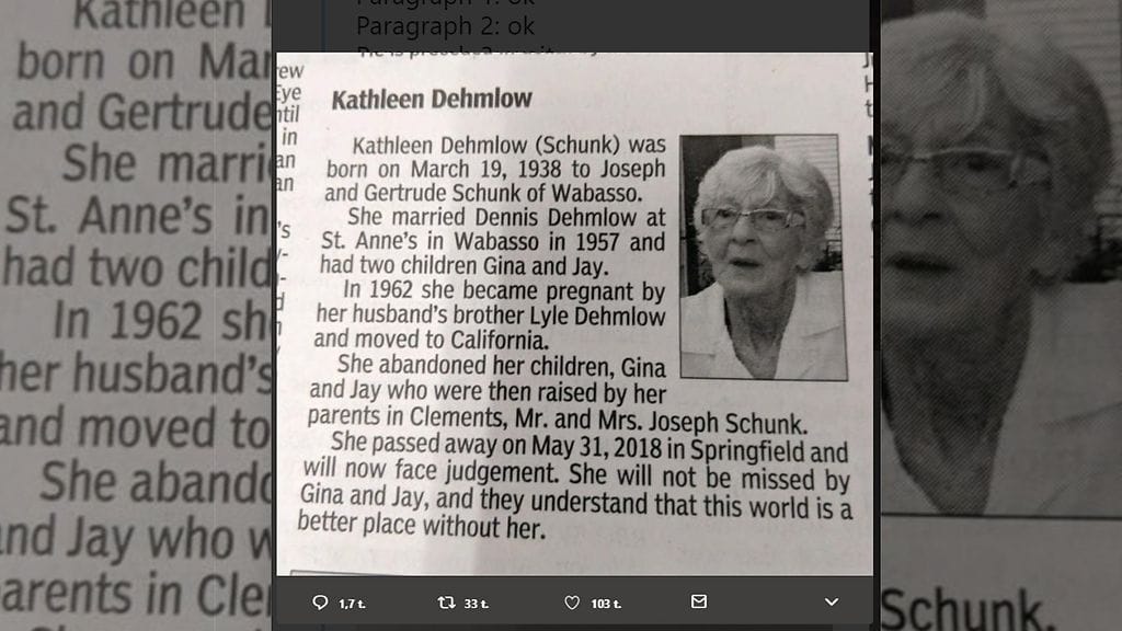 Kathleen Dehmlow'n kuolinilmoitus nousi uutiseksi brutaalin sisältönsä vuoksi. 105 sanan muistokirjoituksessa ei suinkaan listata Dehmlow'n parhaita puolia ja muistella, miten ihana ihminen hän oli – sen sijaan perhe kirjoitti ilmoituksessa, että maailma on parempi paikka ilman Dehmlow'ta.