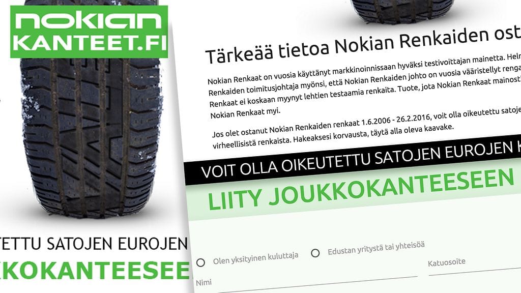 Parhaillaan vireillä oleva Renkaan ostajat v. Nokian Renkaat Oyj -joukkokanne penää hinnanalennusta Nokian Renkaiden valheellisen markkinoinnin johdosta.