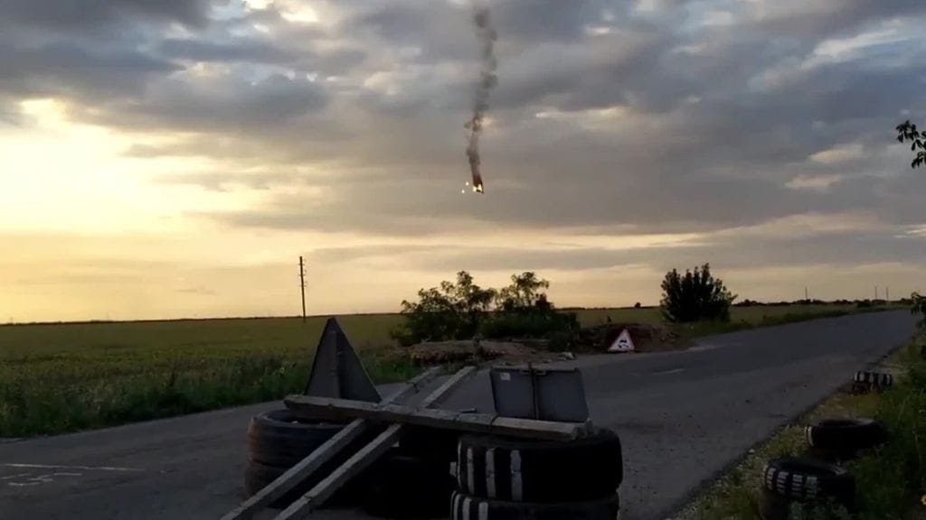 Nova Kah’ovkan kaupungissa Ukrainassa todistettiin 19. heinäkuuta hurjaa hetkeä, kun taivaalla lentänyt venäläishävittäjä sai osuman ohjuksesta.