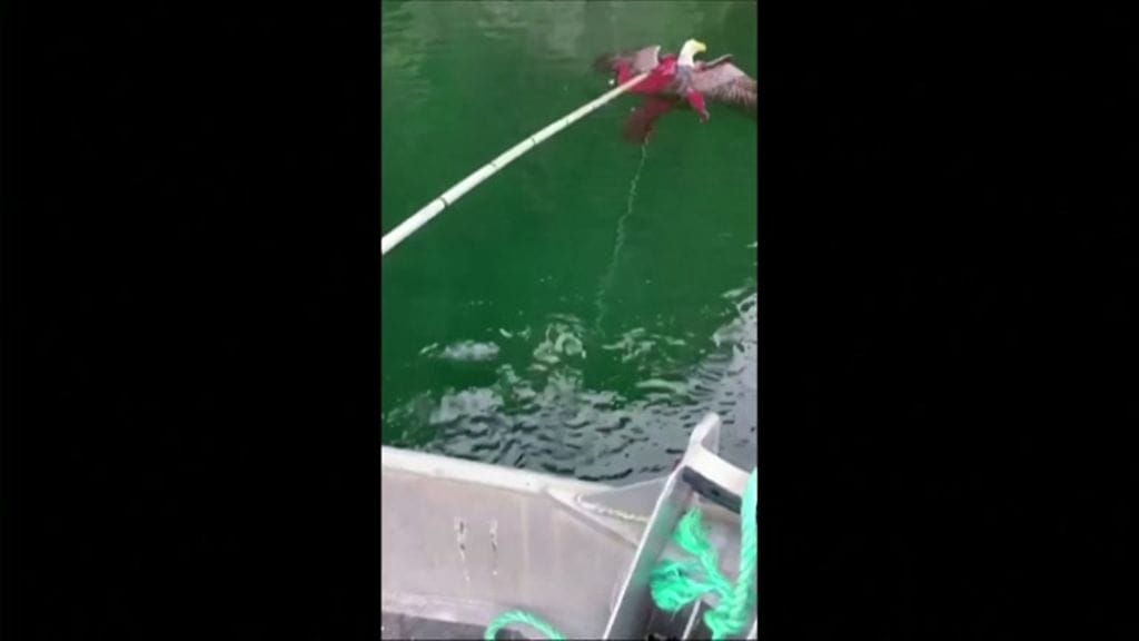 Kanadalaisessa kalankasvattamossa hieraistiin silmiä, kun kotka oli jäänyt kiinni mustekalan lonkeroihin.