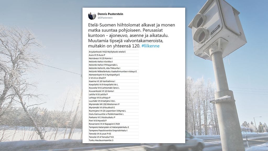 Poliisin liikenneturvallisuuskeskuksen johtaja Dennis Pasterstein julkaisi sosiaalisessa mediassa listan kameratolpista, joiden ohittaminen ylinopeudella johtaa epätoivottuun yhteydenottoon viranomaisilta.