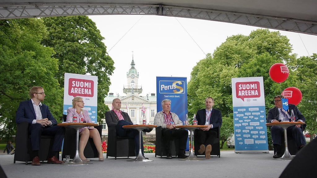 Puheenjohtaja Timo Soini haastoi keskustelijat luettelemaan EU:n hyviä puolia.