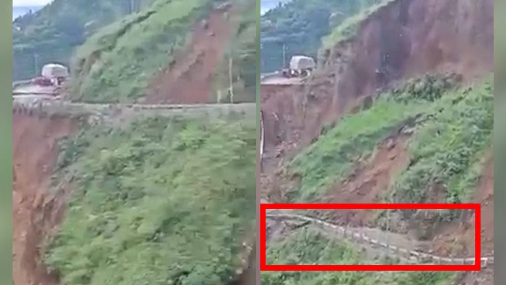 Pian tyrmistyttävän kokoinen maa-alue putoaa vuoren rinnettä alas ja vie mukanaan suuren pätkän tietä.