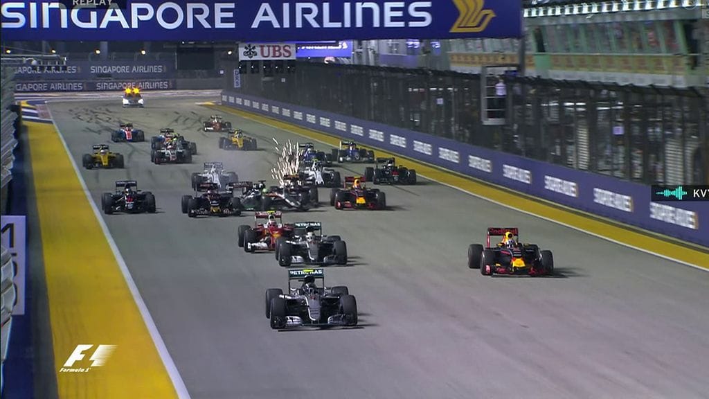 Red Bullin Max Verstappenin surkea lähtö poiki Singaporen GP:n historian ensimmäisen avauskierroksen turva-autotilanteen.