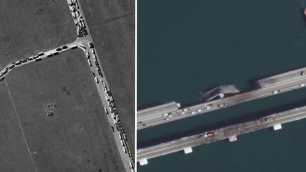 Maxar-yhtiön keskiviikkona ottamista satelliittikuvista paljastuu, että ainakin yksi kaistoista on edelleen täysin poikki, tai tarkemmin sanottuna osittain meressä. Kuvissa näkyy myös kilometrien jonot sillalle johtavilla teillä. Voit katsoa kuvat videolta artikkelin alusta.