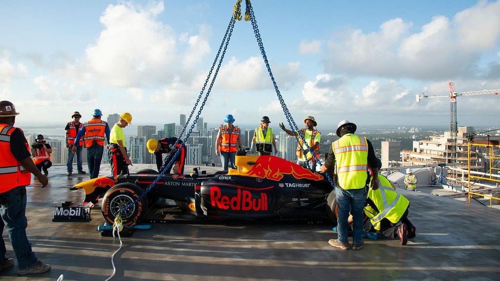 F1-tallin promo-osasto hilasi formula-auton 63-kerroksisen miamilaisrakennuksen katolle ja värväsi legendaarisen F1-kuskin, David Coulthardin, kaasuttelemaan autolla helikoptereiden laskeutumisalustalle.