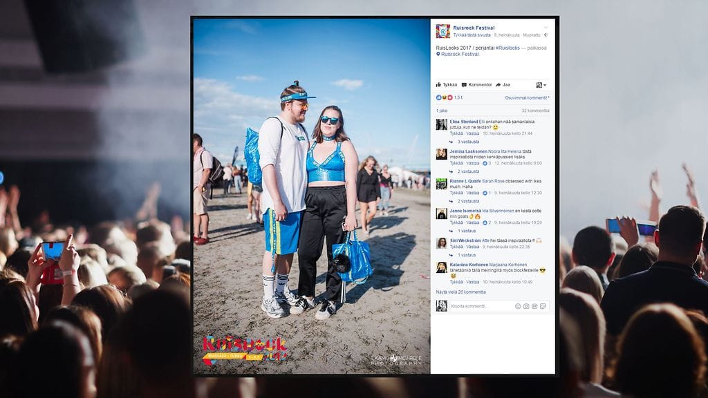 Nyt on käynyt ilmi, että Ikea-kassista saa myös upean festarilookin! Ruisrockin jakamassa kuvassa pariskunta paistattelee auringossa Ikea-kasseista valmistetuissa asuissa. Kokonaisuuden kruunaa tietenkin käsilaukun virkaa toimittava Ikea-kassi.