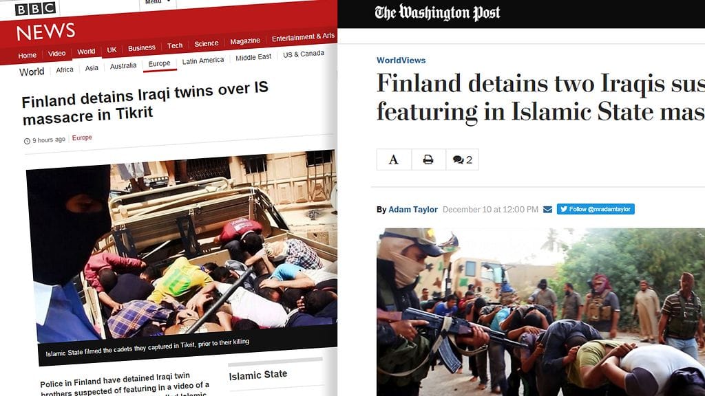 MTV Uutiset kertoi eilen, että Suomessa on käynnissä terrorismimurhaan liittyvä rikostutkinta. Keskusrikospoliisin mukaan epäilykset kohdistuvat kaksosveljiin, joiden epäillään kuuluvan Isis-järjestöön. Heidän epäillään murhanneen viime vuonna Tikritin lähellä 11 puolustuskyvytöntä vankia. Teloitukset on esitetty Isisin propagandavideolla.
