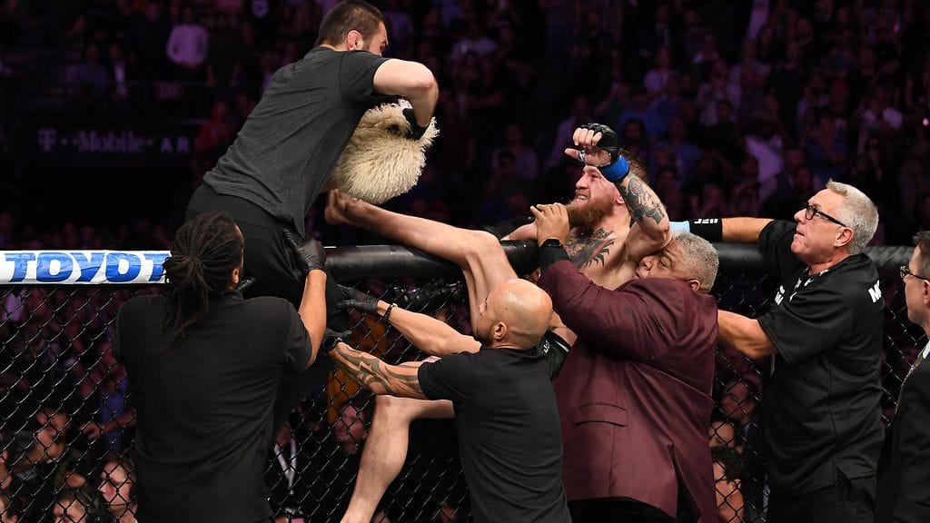 Turvajärjestelyjen petettyä Nurmagomedovin taustajoukkoja ja yleisöä pääsi kehään hyökkäämään McGregoria kohti. Eräs heistä löi McGregoria, ja myös McGregor heilui nyrkkiensä kanssa.