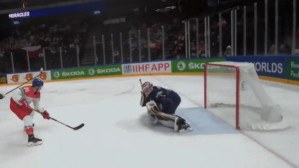 Hughes menetti kiekon hyökkäyssiniviivalla, minkä seurauksena Blümel karkasi läpiajoon. Tehokasta turnausta pelaava tshekki ei erehtynyt, vaan veivasi kiekon näyttävästi verkkoon.