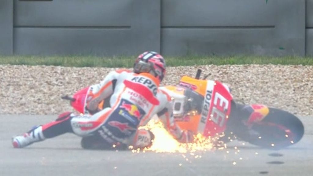 Kun MotoGP:n aika-ajoja oli jäljellä kahdeksan minuuttia, espanjalainen Marc Marquez kaatui ja ajautui pyörällään hiekalle. Marquez ei pystynyt jatkamaan vaan lähti suoraan varikkoa kohti ja hyppäsi varapyöränsä selkään. Vain muutamaa minuuttia myöhemmin Marquez takoi taululle ylivoimaisen ajan 2.03.658, jolla irtosi paalupaikka huomiseen kilpailuun.