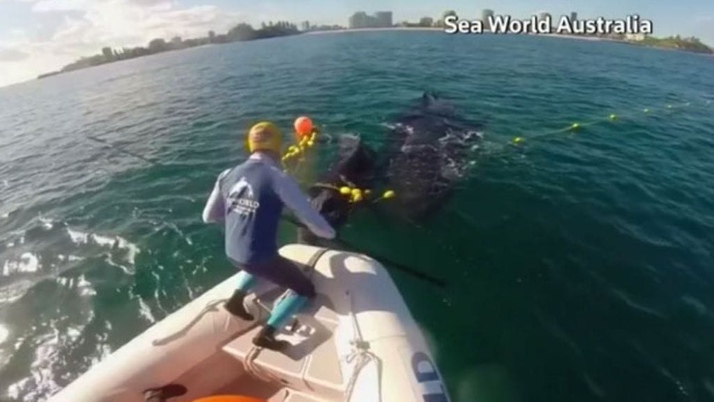 Ryhävalasemo sai apua meripelastajilta, kun sen poikanen oli jäänyt kiinni haiverkkoon. Tapaus sattui Australian länsirannikolla Gold Coastin edustalla.