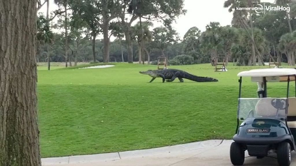 Mikä näky! Katso yläpuolelta, kun jättimäinen alligaattori tallustelee golf-viheriölle!