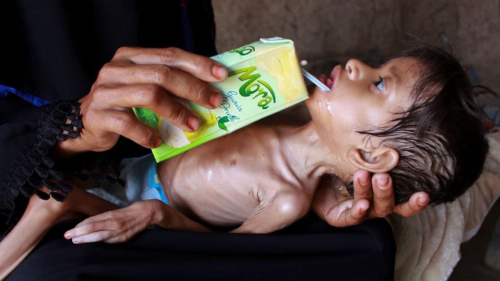 Ylläolevassa kuvassa on yksi aliravitsemuksesta kärsivä: 5-vuotias tyttö, jolle äiti antaa mehua. Kuva on otettu Pohjois-Jemenissä tiistaina. Tyttö painaa kolme kiloa.