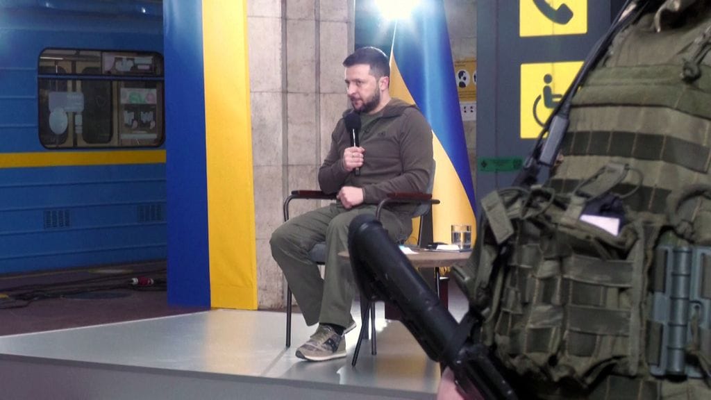 Ukrainan presidentti Volodymyr Zelenskyi piti lauantaina lehdistötilaisuuden Kiovassa maanalaisella metroasemalla.