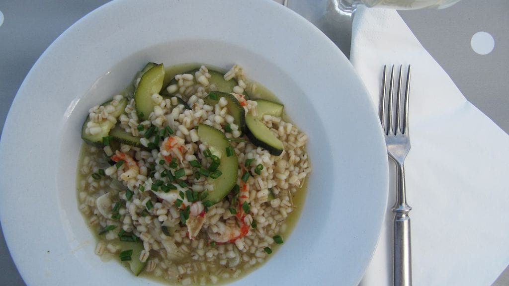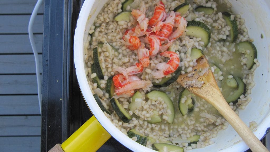 Kesäkurpitsa jaksaa puskea kukkaa ja hedelmää. Tässä sitä on yhdistetty toiseen sesonkiherkkuun, rapuun. Käytin purkitettuja jokiravunpyrstöjä, mutta parhaan lopputuloksen saat luonnollisesti suoraan merroista. Mainio väliruoka rapukesteille! Käytin tapani mukaan risottoriisin sijaan kotimaista ohraa eli kuvissa ohrattoa.