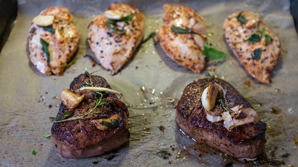 – Aina, kun teet proteiineja pääraaka-aineena, niin aina kypsennetään uunissa. Maustetaan ja otetaan väri pannulla, mutta kypsennys tapahtuu aina uunissa, Aihinen painotti.