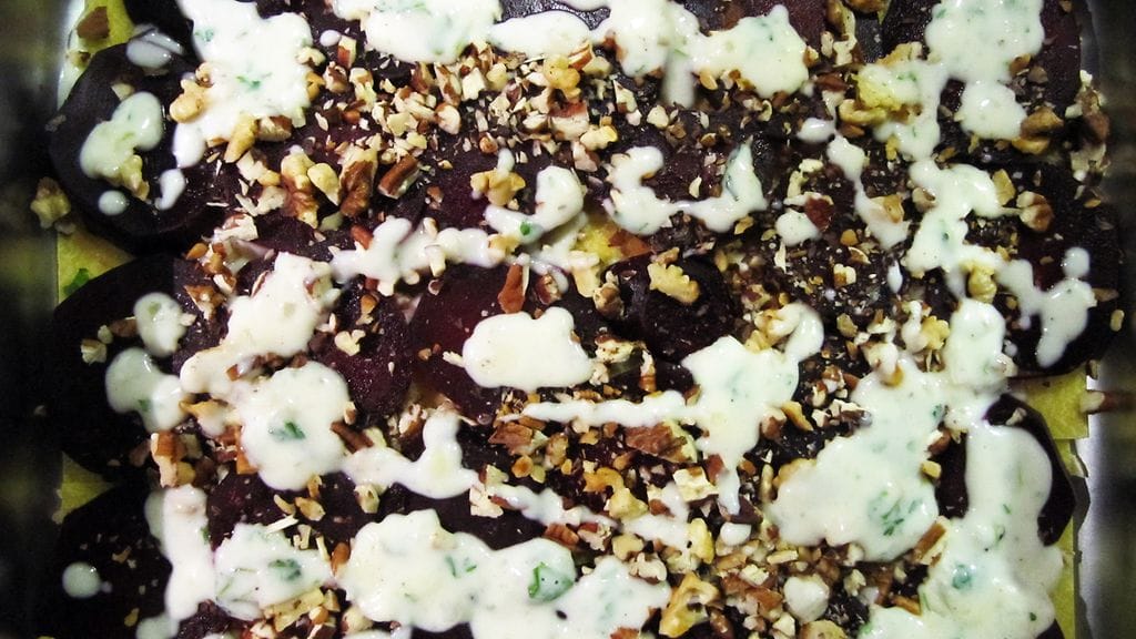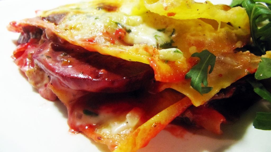 Juhlistan päivää varsin yksinkertaisella kasvisreseptillä. Punajuuri on kotimaisten kasvisten aatelia ja taipuu ruoanlaitossa moneen. Olen tehnyt siitä lasagnea muutamalla eri tavalla. Tässä viimeisin versio. Ihastuin Glogatan 4:n illallisella punajuuren ja maapähkinän liittoon, jonka solmin tässä uudelleen.