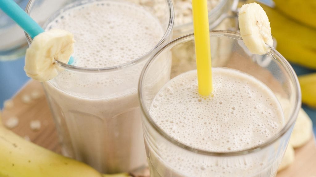 Banaani-kaurasmoothie valmistuu käden käänteessä. Tarvitset ainoastaan kaurahiutaleita, banaanin ja maitoa!