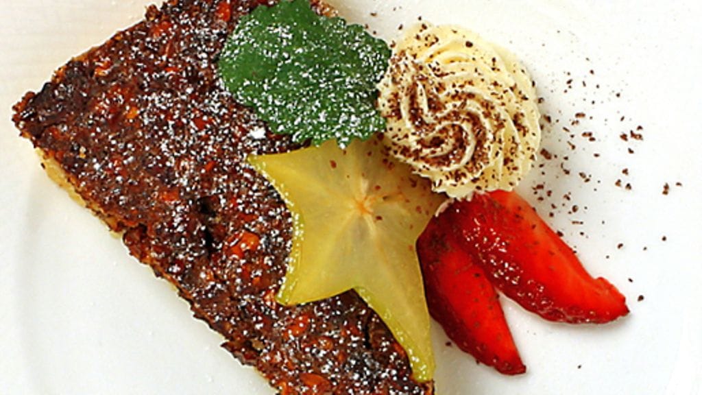 3. Täyte: Rouhi pähkinät ja leikkaa suklaa pieniksi paloiksi. Vatkaa munat ja sokeri- Lisää joukkoon siirappi ja vaniljasokeri. Vatkaa tasaiseksi seokseksi. Kaada joukkoon suklaa ja pähkinärouhe. Kaada täyte piirakkapohjalle. Kypsennä 40-45 minuuttia. Koristele piirakka mansikoilla, sitruunamelissanlehdellä ja karambolaviipaleilla. Tarjoa kermavaahdon kera.