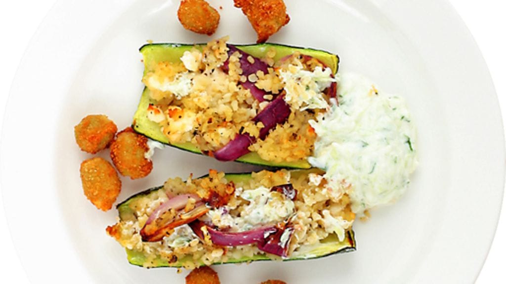 2. Kuumenna uuni 275 asteeseen ja napsauta grillivastus päälle. Halkaise kesäkurpitsat pituussuuntaan ja leikkaa pois päät, koverra pois hedelmäliha. Kuori ja suikaloi punasipuli paksuiksi suikaleiksi. Kuori ja hienonna salottisipuli ja valkosipuli. Kuumenna puolet öljystä kattilassa ja lisää salottisipuli, valkosipuli ja bulgur. Lisää lientä vähän kerrallaan, kunnes kattilaan on muodostunut paksu massa.