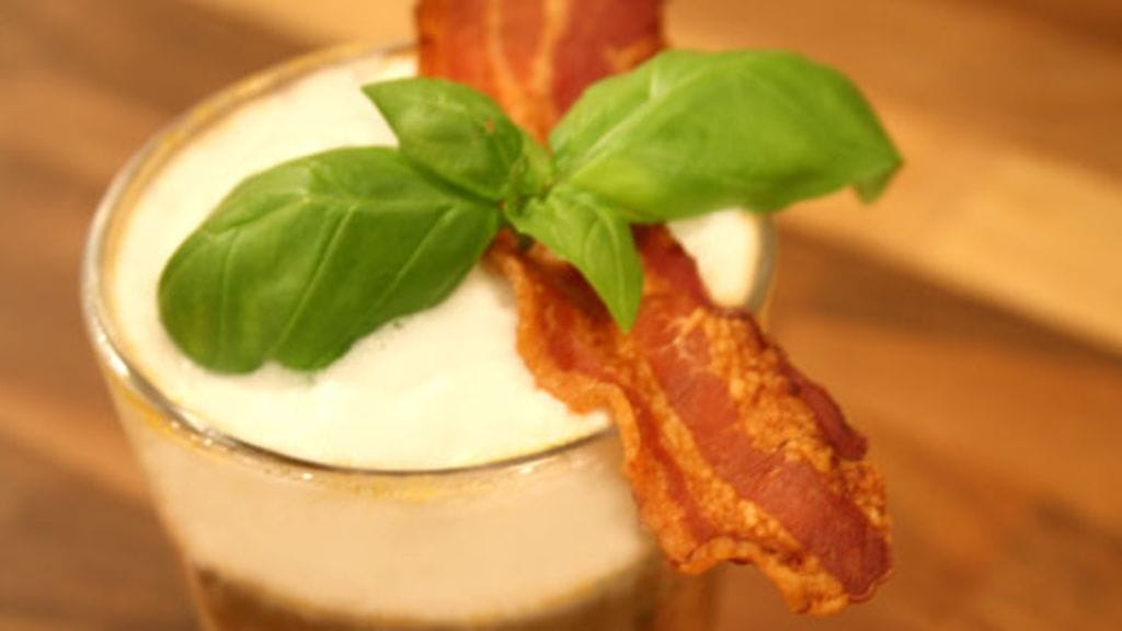 Paista pekoni uunissa siivuina rapeiksi, 180-astetta noin 7 minuuttia.